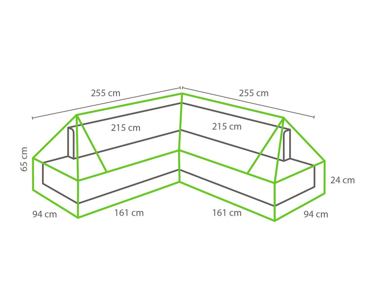 De Outdoor Covers hoes voor L-vormige loungesets is de perfecte oplossing om je loungeset te beschermen! Met afmetingen van 255x255 cm, een diepte van 94 cm en een maximale hoogte van 65 cm, sluit de hoes naadloos aan op je meubel. Speciaal ontworpen voor loungesets met een plateau of platform, loopt de hoes schuin af tot 24 cm aan de zijkanten. Dit slimme ontwerp voorkomt dat water zich ophoopt, in tegenstelling tot vierkante hoezen waarin waterzakken kunnen ontstaan.